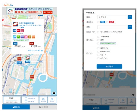 これらのご要望にお応えするため、当社保険契約者限定※のオリジナルサービスとして、「カーライフサービス」内にガソリンスタンドと駐車場の両方を1画面で検索できる「SA・PO・POカーライフマップ」を新設しました。「カーライフマップ」の提供により、よりお得で便利なカーライフの実現をサポートしてまいります。