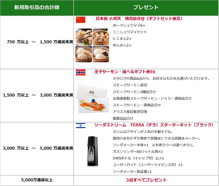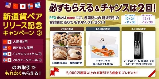 新通貨ペア追加を記念して、2022年10月24日より『パートナーズFX』および、『パートナーズFXnano』における「人民元/円」「米ドル/人民元 ※」「イスラエルシュケル/円」「ノルウェークローネ/円」の新規取引の合計額に応じて、上記4通貨ペアの国にちなんだ賞品をプレゼントいたします。