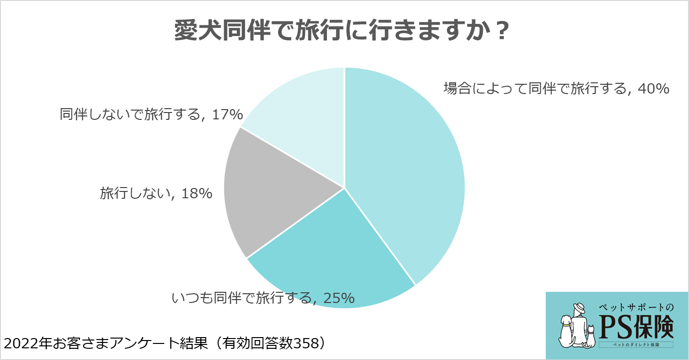 犬の飼い主に愛犬同伴の旅行について伺ったところ、「場合(時や場所)によって同伴で旅行に行く」と回答したのが40%、「いつも同伴で旅行する」が25%と、全体の65%が「愛犬と同伴で旅行する」という結果になりました。