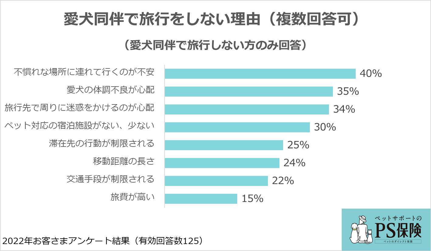 最も回答率が高かったのは「不慣れな場所に連れて行くのが不安」(40%)で、2位は「愛犬の体調不良が心配」(35%)、3位は「旅行先で周りに迷惑をかけるのが心配」(34%)、4位は「ペット対応の宿泊施設がない、少ない」(30%)です。