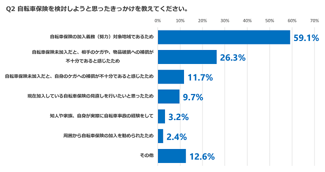 自転車保険の検討きっかけ(複数回答可)は「自転車保険の加入義務(努力)対象地域であるため」が59.1%と最も多く、次いで「自転車保険未加入だと、相手のケガや、物品破損への補償が不十分であると感じたため」が26.3%、「その他」を除き「自転車保険未加入だと、自身のケガへの補償が不十分であると感じたため」が11.7%と続きました。