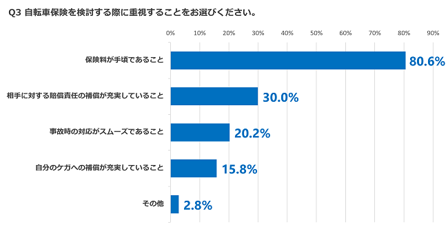 自転車保険検討時に重視すること(複数回答可)は「保険料が手頃であること」が最も多く80.6%。次いで「相手に対する賠償責任の補償が充実していること」が30.0%、「事故時の対応がスムーズであること」が20.2%と続きました。