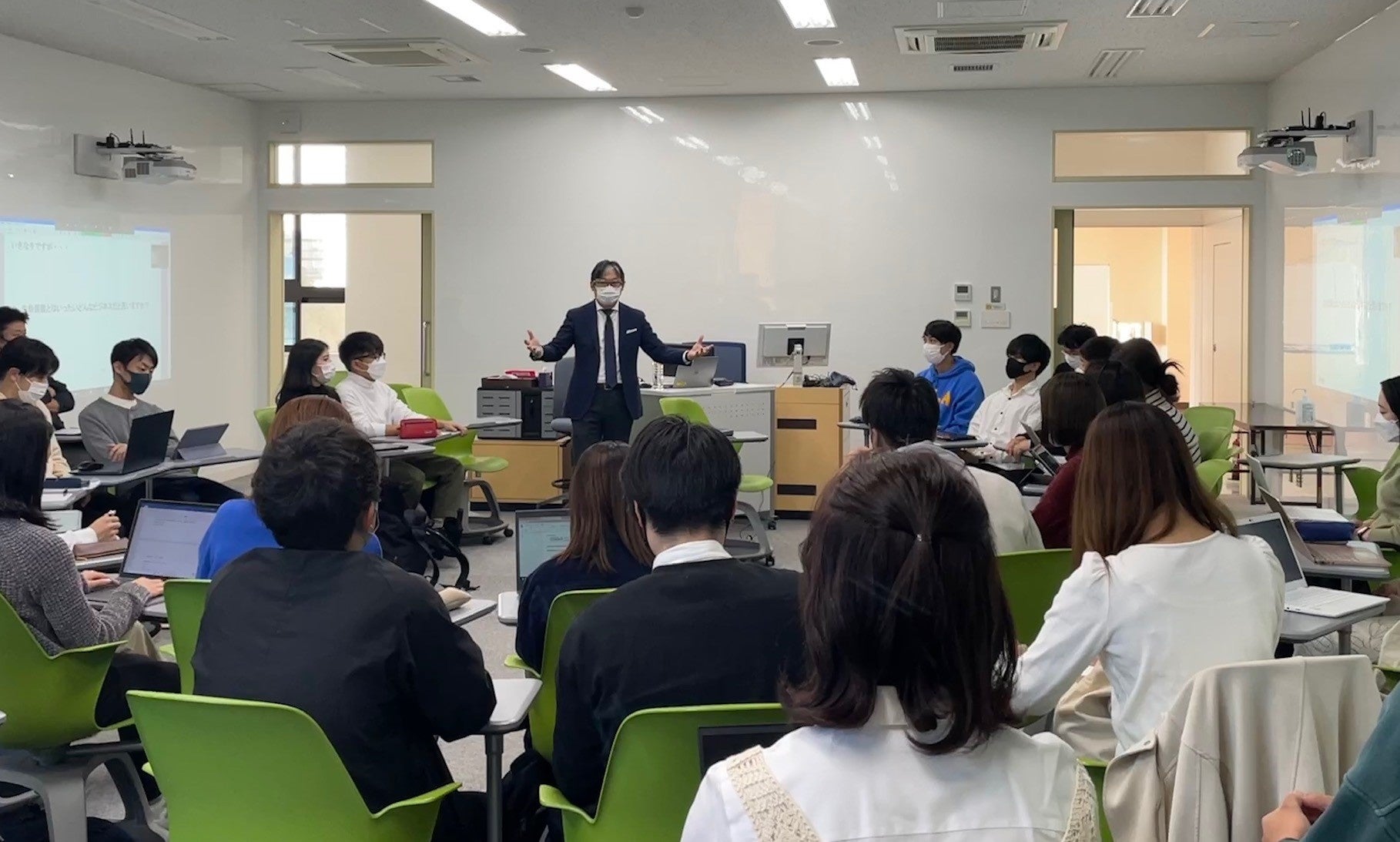 今回の講座では、当社の経営企画の担当役員である前中康浩が講義を行いました。神戸市外国語大学外国語学部の3・4年生(約30名)が講義に参加し、「グローバルにおける日本の生命保険ビジネスの特徴」「生命保険はどのような社会課題を解決できるのか」等について、日本や各国の生命保険業界のデータや、人口動向や寿命の推移、コロナ禍で変化した市場環境等を交えて話しました。