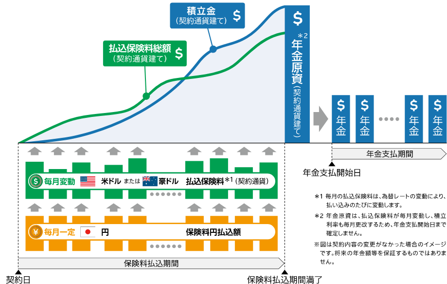 (1)毎月一定金額を円でお支払いただき、積立金は運用成果が期待できる外貨(米ドル・豪ドル)で運用します*¹