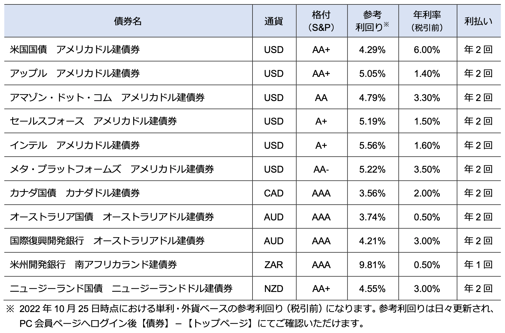 今回の銘柄追加では、昨今の米国を中心とする海外金利の上昇に伴う外貨建て金融商品への投資ニーズを踏まえて、当社初となるアメリカドル建て債券として米国国債や米国IT大手企業のアップル、アマゾンなどの社債を追加したほか、オーストラリアドル・ニュージーランドドル建て債券、経済成長率の高い新興国の南アフリカランド建て債券など、新たに11銘柄を厳選しました。この機会に、当社の外国債券取引をぜひお試しください。
