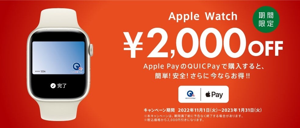 概要 期間中、対象店舗でApple WatchをApple PayのQUICPayで購入すると、その場で税込価格から2,000円引き(Google PayやカードタイプのQUICPayは対象外となります)