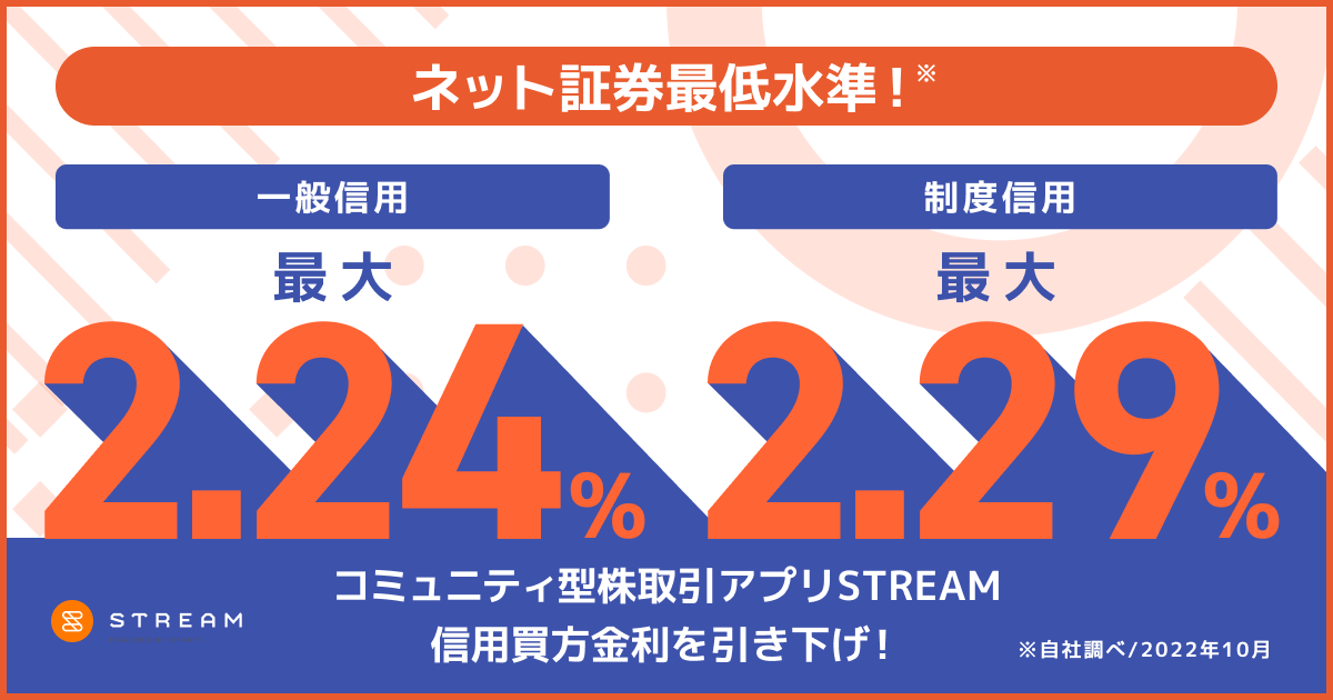 次世代金融インフラの提供を通して組込型金融を実現し、金融がもっと暮らしに寄り添う世の中を創るFinatext グループの株式会社スマートプラス(本社:東京都千代田区、代表取締役:小林 紀子、以下「当社」)は、2022年11月1日(火)約定分(11月4日受渡分)より、コミュニティ型株取引アプリ『STREAM(ストリーム)』にて、ソーシャルステータス(※2)クラスA〜Dのユーザーの皆様を対象に、国内株式の信用取引(制度/一般信用)における買方金利を、従来の「一般信用2.74%〜3.44%・制度信用2.79%〜3.49%」からネット証券業界最低水準(※1)となる「一般信用最大2.24%・制度信用最大2.29%」に引き下げます。なお、信用取引における従来型手数料は引き続き無料です。