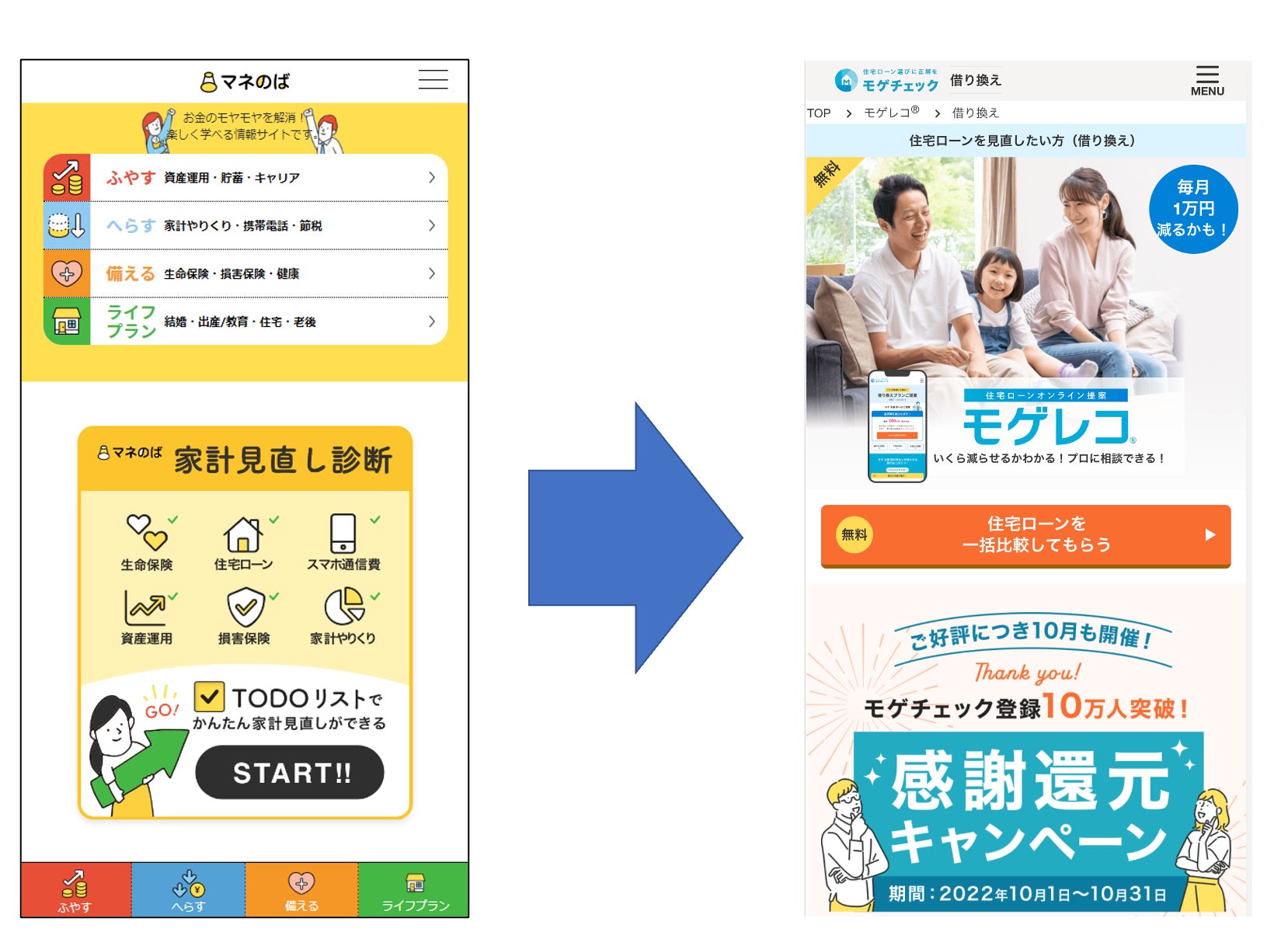 「マネのば」サイト内の家計の固定費見直し診断の項目のうち、住宅ローンの見直しを検討しているユーザーに対し住宅ローン比較サービス「モゲチェック」の借り換えサービスサイトに遷移できる導線を「マネのば」内に設置します。この取り組みによって、住宅ローン返済中のユーザーは、家計の中で最大の固定費である住宅ローンの見直しをスムーズに行うことができます。