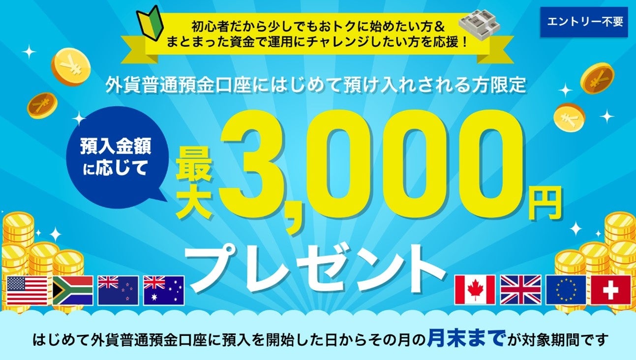GMOあおぞらネット銀行(以下、当社)は、初めて外貨普通預金のお取引を開始されるお客さま向けの常設プログラムをリニューアルし、本日2022年11月1日より新たなプログラム「はじめての外貨普通預金で預入金額に応じて最大3,000円プレゼント」を開始いたします。