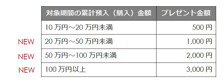 これまでは、1回のお取引で10万円以上の預け入れをすると500円プレゼントするのみでしたが、本日より10万円以上の預入で最大3,000円をプレゼントする常設プログラムにリニューアルいたしました