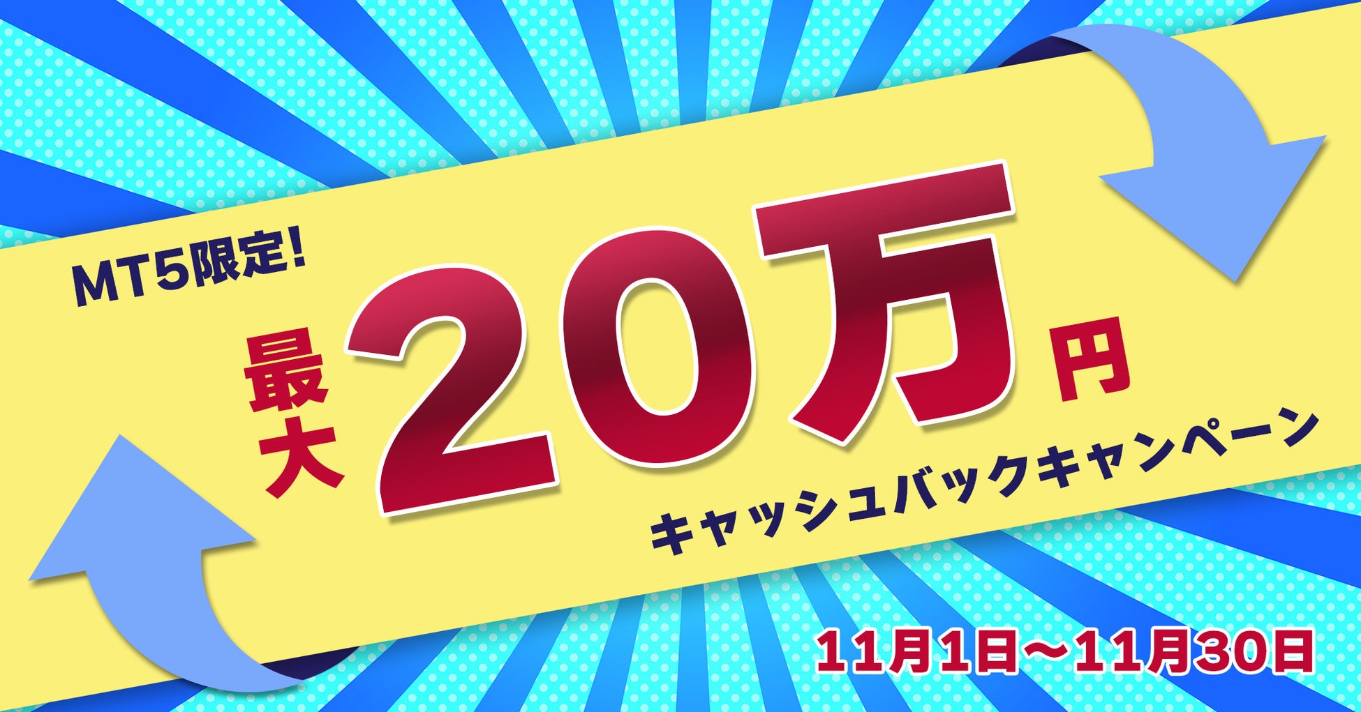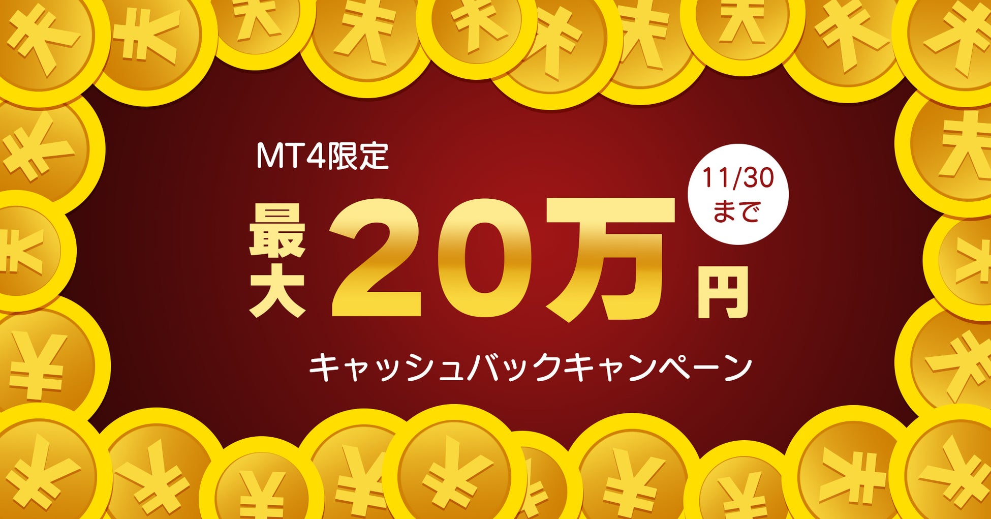 【キャンペーン詳細】期間中にMT4で50ロット以上決済取引されたお客様に、決済ロット数に応じて最大20万円をキャッシュバックいたします。