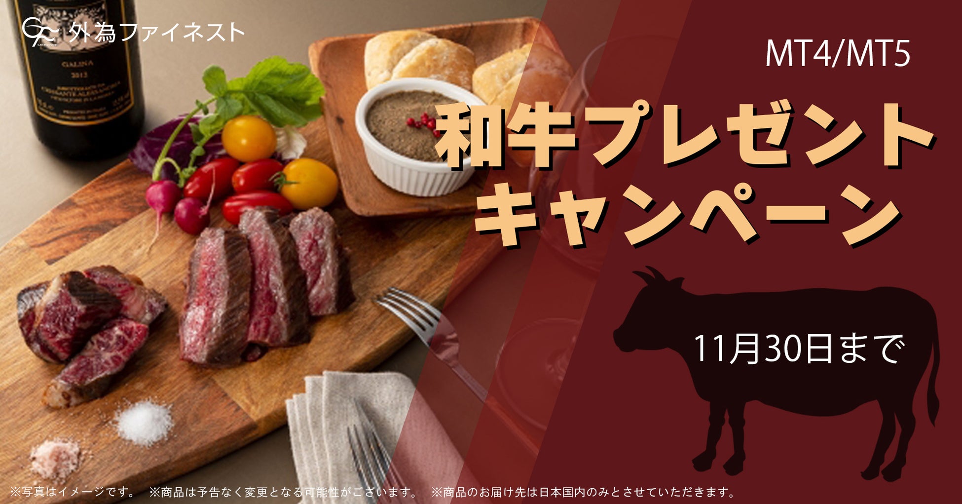 外為ファイネスト株式会社(本社:東京都千代田区、代表取締役:石野由美子)は、11/1より最大20万円キャッシュバックの「MT5/MT4キャッシュバックキャンペーン」、2ロット以上決済取引されたお客様の中から抽選で10名様に和牛カタログをプレゼントする「和牛プレゼントキャンペーン」や「MT4カムバックキャンペーン」を実施中です。