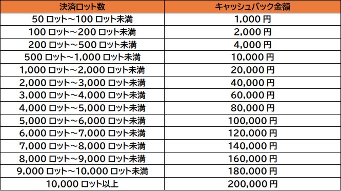 期間中にMT5で50ロット以上決済取引されたお客様に、決済ロット数に応じて最大20万円をキャッシュバックいたします。