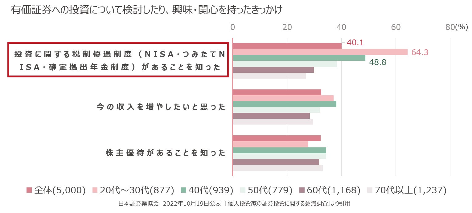 日本証券業協会が2022年に実施した「個人投資家の証券投資に関する意識調査」によると、【有価証券への投資について検討したり、興味・関心を持ったきっかけ】の最も多い回答は、【投資に関する税制優遇制度(NISA・つみたてNISA・確定拠出年金制度)があることを知った】が40.1%でした。この回答割合は2020年調査結果の37.6%から2.5%上昇しており、投資の税制優遇への関心は高まっていることがわかります。また、20代~30代、40代の回答割合が他の年代と比べて高い結果となっております。