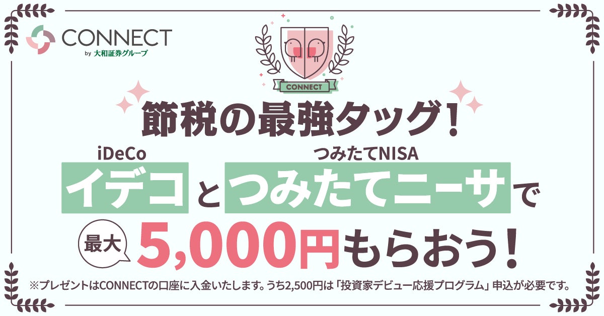 CONNECTの口座開設をした方に「投資家デビュー応援プログラム」で2,500円分の株または投資信託をプレゼント!さらに、CONNECTからダイワのiDeCoへの加入で1,000円、つみたてNISAの開設で1,500円、最大5,000円をプレゼントいたします。