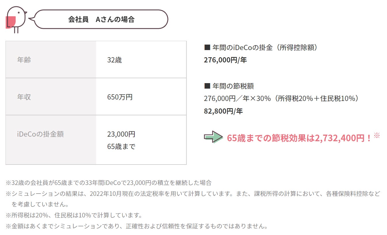 例えば、会社員の方(32歳年収650万円、企業年金未加入)が、毎月2万3,000円をiDeCoで積み立てた場合、年間8万2,800円の節税、積立期間合計※で273万2,400円の節税ができます。