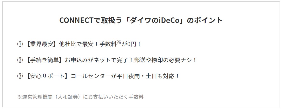 大和証券グループの株式会社CONNECT(本社:東京都中央区、代表取締役:大槻 竜児、以下「CONNECT」)は、大和証券株式会社(本社:東京都千代田区、代表取締役:中田 誠司、以下「大和証券」)が運営管理機関として提供する「ダイワのiDeCo」受付取扱いを2022年11月1日より開始いたします。