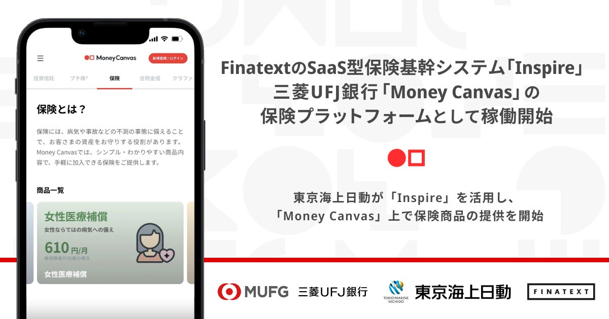 次世代金融インフラの提供を通して組込型金融を実現するFinatextグループの株式会社Finatext(本社:東京都千代田区、代表取締役CEO:木下 あかね、以下「当社」)は、当社のSaaS型保険基幹システム「Inspire(インスパイア)※特許出願中」が、株式会社三菱UFJ銀行(本社:東京都千代田区、取締役頭取執行役員:半沢 淳一、以下「三菱UFJ銀行」)が提供する資産形成総合サポートサービス「Money Canvas」(以下「Money Canvas」)に導入され、2022年10月29日(土)から同サービスの保険プラットフォームとして稼働を開始したことをお知らせします。また、「Money Canvas」の「Inspire」導入を受け、東京海上日動火災保険株式会社(本社:東京都千代田区、取締役社長:広瀬 伸一、以下「東京海上日動」)が「Inspire」を活用して「Money Canvas」上で保険商品の提供を開始しました。