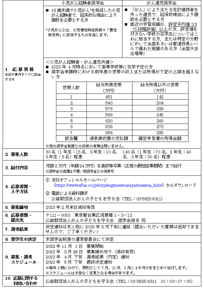 アフラック生命保険株式会社(代表取締役社長:古出 眞敏)は、今年で28年目を迎える「アフラック小児がん経験者・がん遺児奨学金制度」の2023年度新規奨学生を2022年11月1日(火)から2023年2月28日(火)まで募集します。「アフラック小児がん経験者・がん遺児奨学金制度」は高校生を対象とした、小児がんを経験した子どもと親をがんで亡くした子どもの夢を応援する奨学金制度で、2023年度の募集人数は小児がん経験者奨学金で30名、がん遺児奨学金で140名の合計170名です(募集概要については別紙参照)。