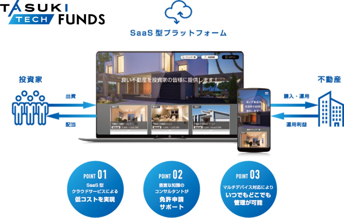 「TASUKI TECH FUNDS」は、不動産特定共同事業法の電子募集を不動産事業者が実施するために必要となるクラウドファンディングプラットフォームを提供するサービスです。