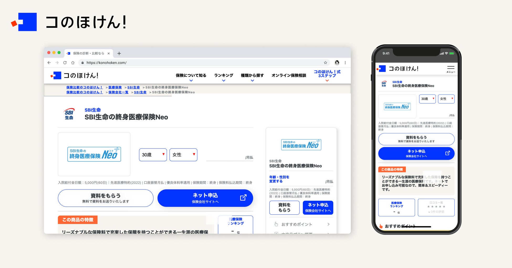「コのほけん!」に掲載を開始した「SBI生命の終身医療保険Neo」は、インターネットまたは、郵送でお申し込みいただける保険商品です。「コのほけん!」PCサイトおよびスマートフォンサイトにて、商品の詳細をご確認頂けます。