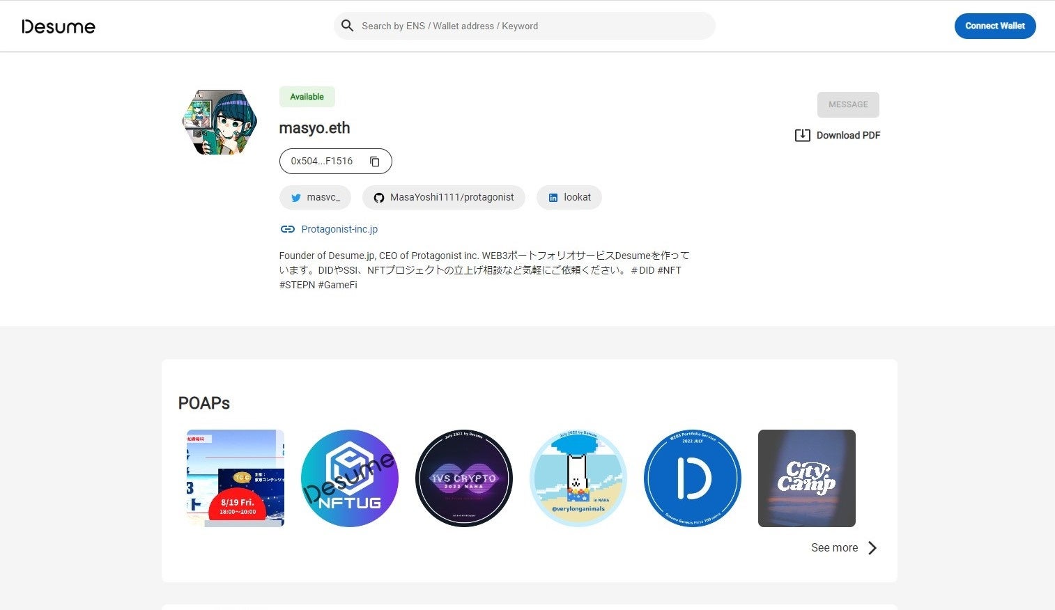 「Desume」(https://desume.jp/)は、オンチェーンデータを活用した次世代採用サービスです。ウォレットアドレスを連携することで、自動的に保有NFTやPOAP(Proof of Attendance Protocol)、その他トランザクションや保有仮想通貨などの情報を取得し、既存の履歴書では分からないWeb3の経歴や実績をポートフォリオ化します。