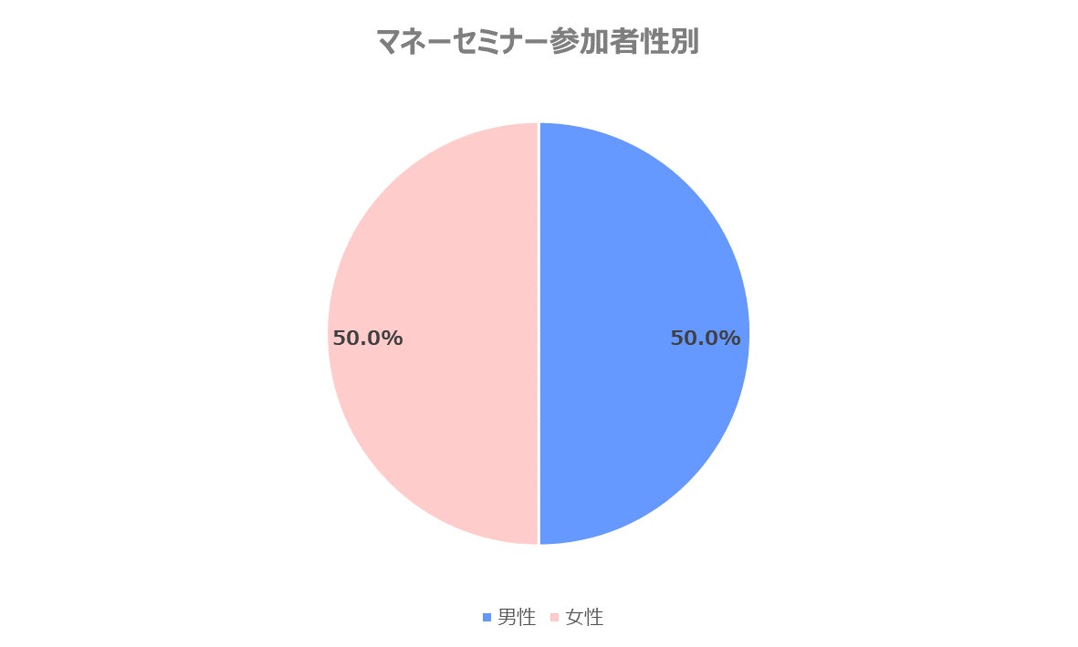 マネーセミナー参加者の年代は、20代14.3%、30代57.1%となっており、あわせて7割以上を占めています。2022年4月から高校の授業で投資教育が義務化されたこともあり、今後はますます低年齢化していくことが想定されます。また、男女比は半々となっており、男女問わず興味を持たれているということがわかります。