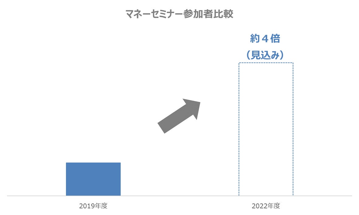 そのようななか、当社では2019年より結婚相談所「パートナーエージェント」で婚活されている会員様向けに投資、資産運用、保険加入などお金全般に関するマネーセミナーを実施してきましたが、2019年度と2022年度(見込みを含む)を比較したところ参加者数が約4倍となっております。