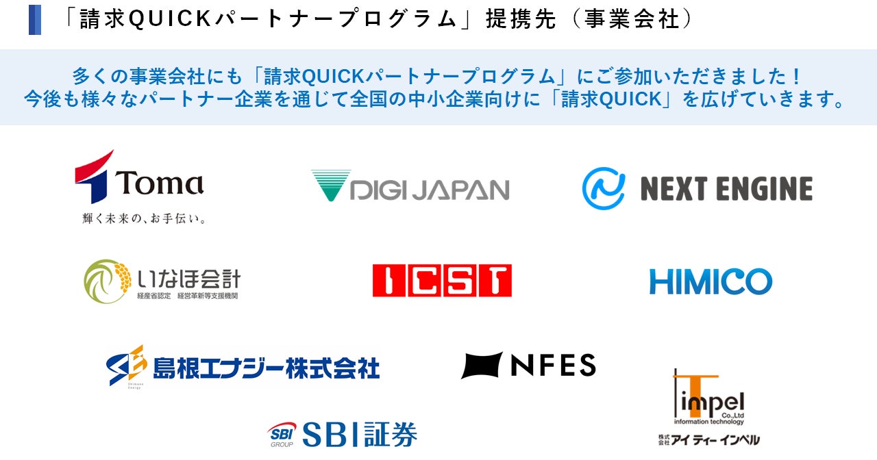 すでに本プログラムのパートナー企業として、8月に株式会社島根銀行およびTOMAコンサルタンツグループ株式会社にご参加いただいておりますが、新たに10行の地域金融機関と11社の事業会社にパートナープログラムにご参加いただきました。今後は、地域金融機関の各エリアの中小企業およびあらゆる業態のパートナー企業の顧客層において、「請求QUICK」のSaaS機能によるインボイス制度対応や、FinTechサービスを活用したさまざまな経理DXの取り組みを、当社と相互協力・連携のもと推進していくことを併せてお知らせいたします。