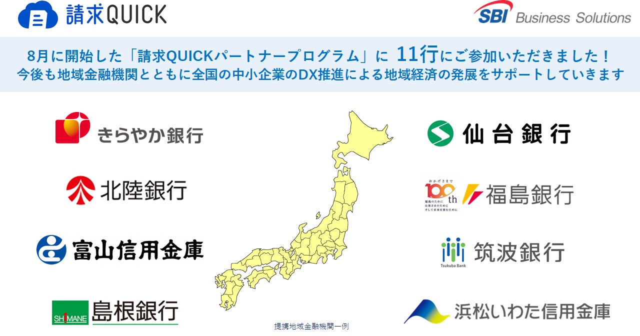 総合フィンテックソリューション企業であるSBI FinTech Solutions株式会社の子会社で、バックオフィス支援サービスを提供するSBIビジネス・ソリューションズ株式会社(本社:東京都港区、代表取締役社長:夏川 雅貴、以下「当社」)は、オンライン決済機能などのFinTechサービスを組み込んだ請求書発行システム「請求QUICK」のパートナープログラムにおいて、11行の地域金融機関および税理士系コンサルティング会社をはじめとする12社の事業会社にご参加いただきましたので、お知らせいたします。