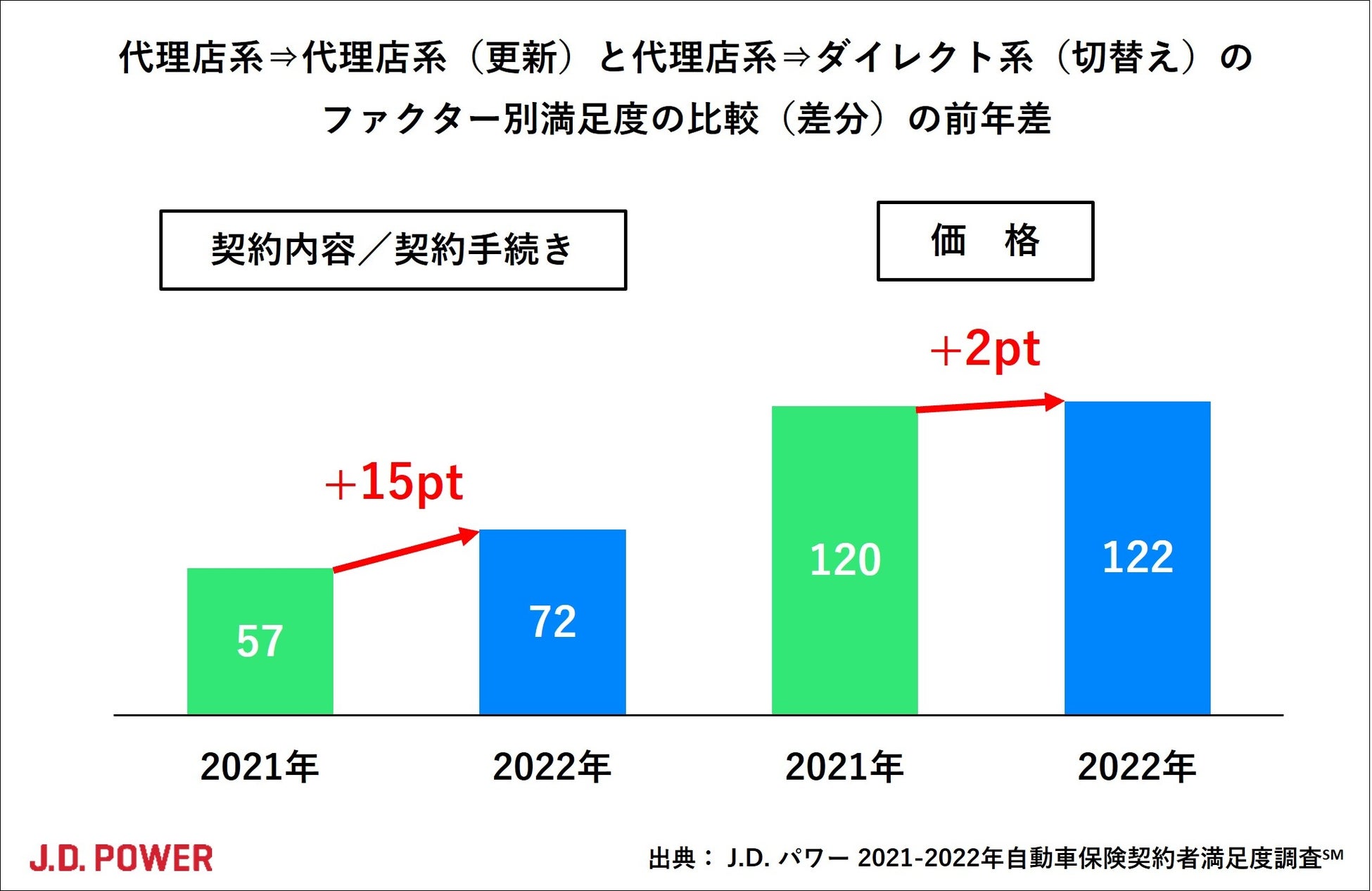 前年調査(2021年11月発表)では、代理店系の顧客満足度が向上し、ダイレクト系は横ばいであったが、本年調査ではダイレクト系が向上した。