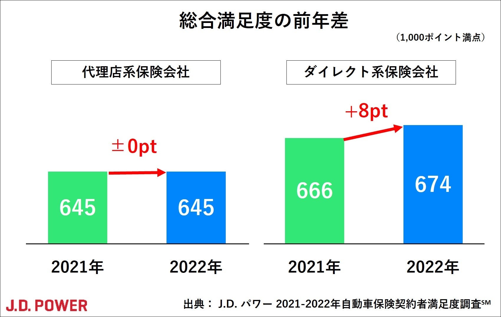 本年調査の総合満足度は、代理店系保険会社*¹ の部門平均は前年と同スコアの645ポイント、ダイレクト系保険会社の部門平均は前年比+8ポイントの674ポイント(共に 1,000 ポイント満点)となった。