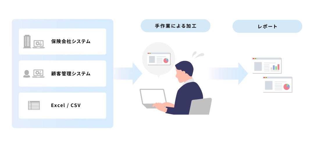 保険代理店では顧客本位の業務運営や売上向上のために様々な集計業務を行っており、その業務量は多く、企業活動において大きな負担となっています。現状として、保険会社システムや顧客管理システムから集計用のデータを取得し、加工するステップを踏まなければ全体の状況が把握できない。それゆえ、全体の状況を早期に把握し、迅速な経営判断を実行することが難しい。というお声が経営者の皆様から頻繁に寄せられています。