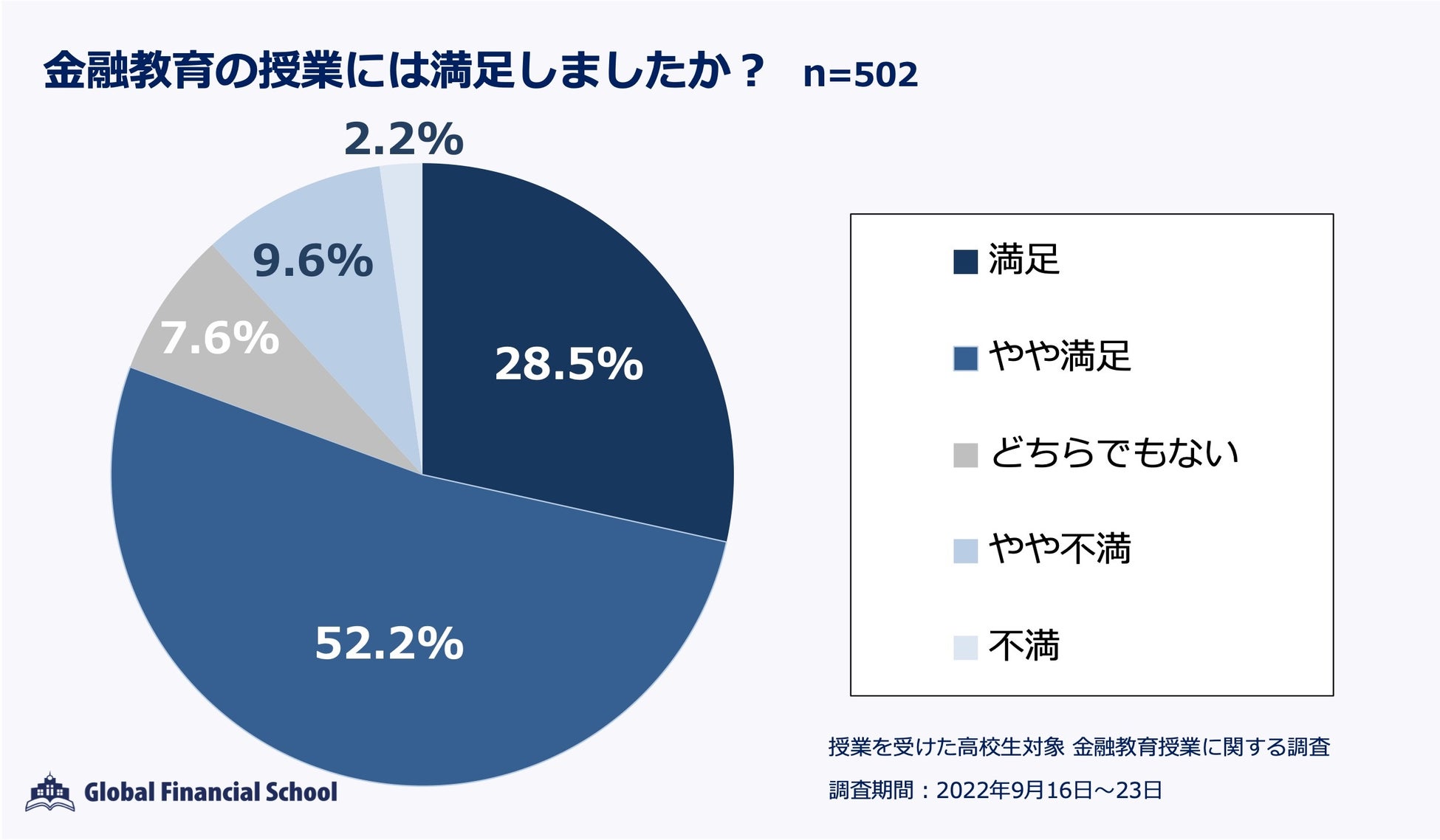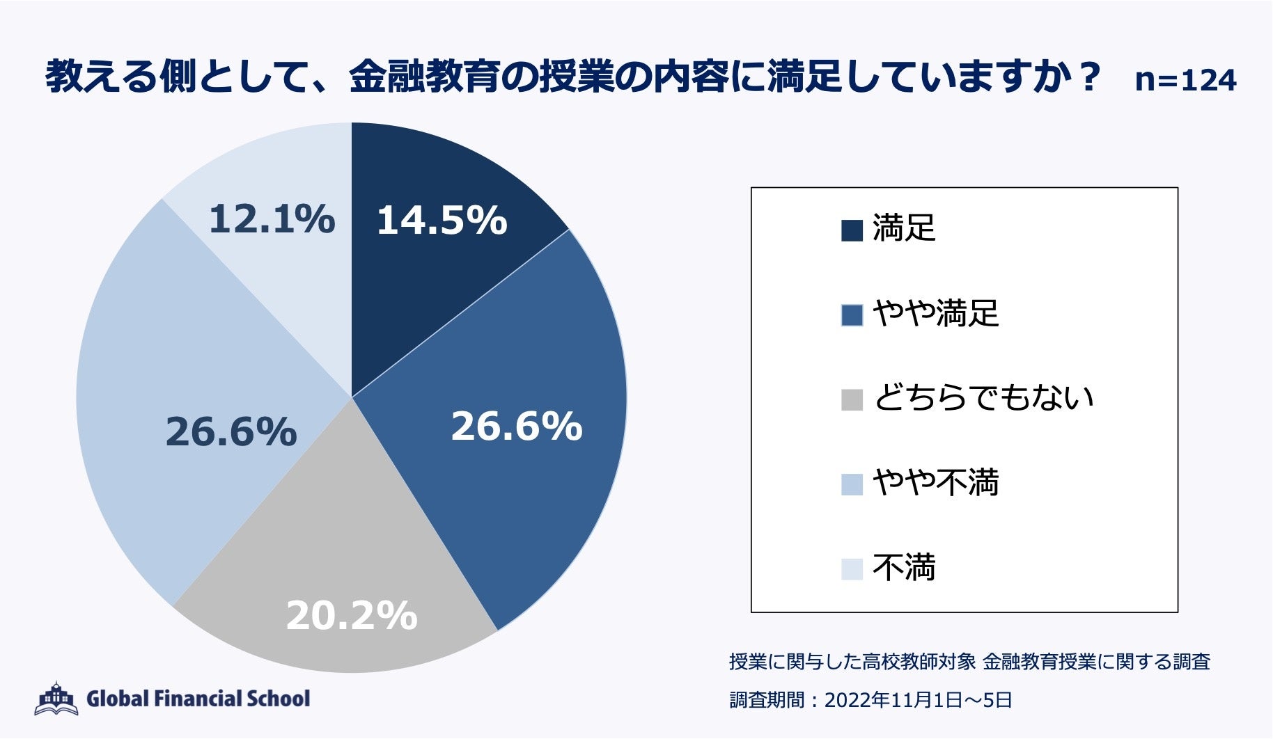 金融教育の内容に対する教師の満足度は、「満足」 14.5%、「やや満足」 26.6 %と 、 約 4 割がポジティブな回答を選択 。なお今年 9 月に行った高校生向けの金融教育アンケートでは、8 割がポジティブな回答を選んだことと比較すると、 教える側と教えられる側で金融教育に対する評価が分かれることがわかりました。