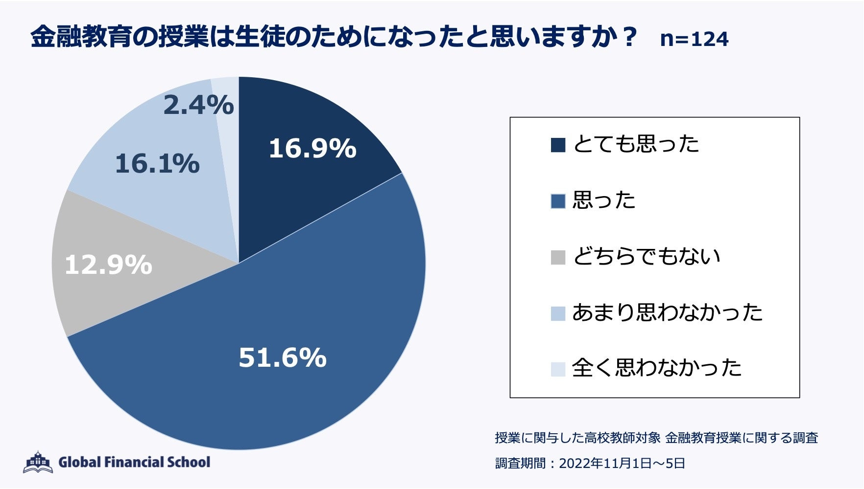 生徒のためになったかという質問では、「とても思った」 16.9% 、「思った 」 51.6% と、 7 割近くの教師が生徒のためになったと考えています 。理由としては「生徒の反応が良かった」「今の時代に必要とわかってもらえた」「外部講師を招いてためになった」「 今後の資産形成に役に立つ」というコメントがありました。