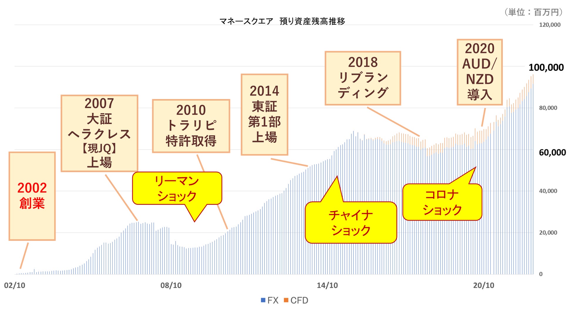 株式会社マネースクエア(本社:東京都港区、代表取締役社長:藤井 靖之、以下「当社」といいます。)は、この度FX取引とCFD取引の預り資産残高の合計額が、2022年11月8日時点で、初めて1,000億円に到達いたしましたのでお知らせいたします。