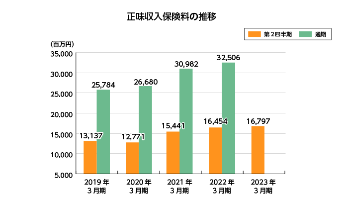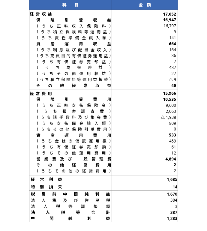 元受正味保険料(※1)が24,977百万円(対前年同期比2.5%増)、正味収入保険料(※2)が16,797百万円(同2.1%増)、保険引受収益が16,947百万円(同3.0%増)となり、経常収益は17,652百万円(同4.4%増)となりました。