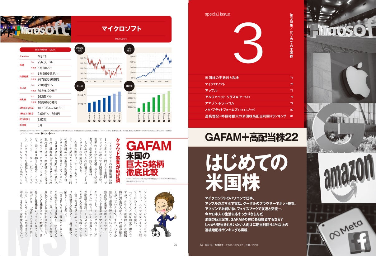 第3特集は「はじめての米国株」。ネット証券などで買える米国株は3000銘柄以上に増えていますが、こちらの特集では〈5銘柄だけ〉を詳し~く分析しています。
