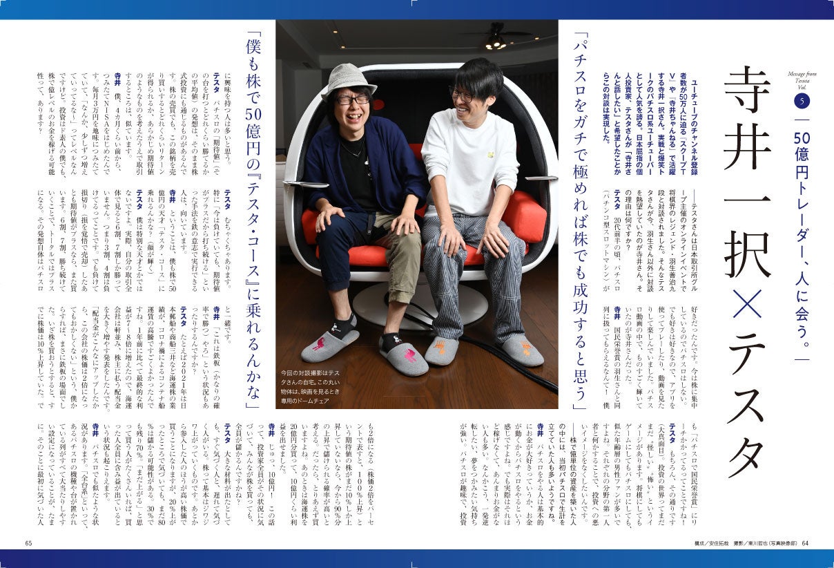 50億円トレーダー・テスタさんと、パチンコ・パチスロ実況解説で支持を得る寺井一択さんの対談は爆笑の連続。株式投資と、パチンコ・スロット。似ているところ、違うところを、それぞれの立場から遠慮なく語り合っています。