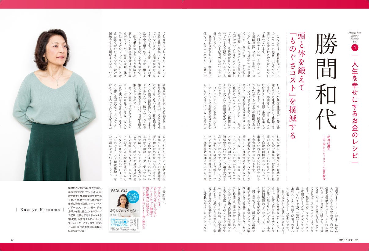 大人気の経済評論家、勝間和代さんの連載は「ものぐさコスト」がテーマ。誰もが持っている“なまけ心”から無駄なお金がかかることについて、対策法を書いています。