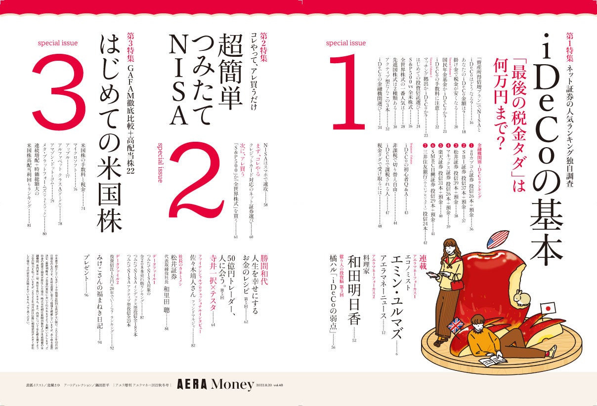 大好評「AERA Money」の2022「秋冬」最新号! 3大特集は「iDeCoの基本」「超簡単つみたてNISA」「はじめての米国株」。巻頭インタビューには人気エコノミストのエミン・ユルマズさん、料理家の和田明日香さんが登場。特別対談に寺井一択さん×テスタさん!