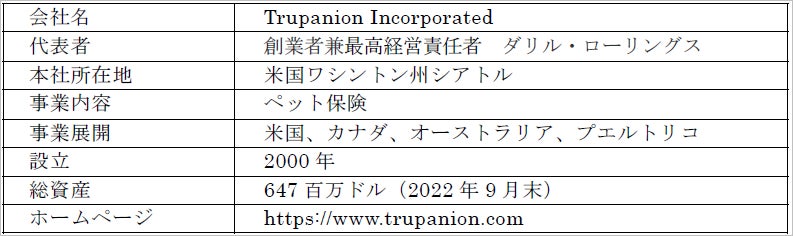 トゥルーパニオンは、米国、カナダ、欧州、プエルトリコ、オーストラリア全域における犬・猫向けの医療保険のリーダーであり、80万匹以上のペットが同社の保険に加入しています。20年以上にわたって、トゥルーパニオンはペットの飼い主が経済的な負担を抱えずにペットの回復に専念できるよう、飼い主に安心をお届けしてきました。トゥルーパニオンは、ペットの生涯にわたって無制限に保険金が支払われる最高価値のペット医療保険をペットの飼い主に提供することにコミットしています。トゥルーパニオンには特許取得済みのプロセスがあり、精算時に数秒で獣医に直接支払いを行うテクノロジーを有する唯一のプロバイダーです。トゥルーパニオンはNASDAQに「TRUP」のシンボルで上場されています。同社は2000年に設立され、本社は米国ワシントン州シアトルにあります。トゥルーパニオンの保険証券は、米国では全額出資保険会社であるAmerican Pet Insurance Companyが、カナダではOmega General Insurance Companyが発行しています。Trupanion Australiaは、トゥルーパニオンとHollard Insurance Companyの共同経営会社です。trupanion.comからアクセスしていただくと、より詳細な情報をご覧いただけます。