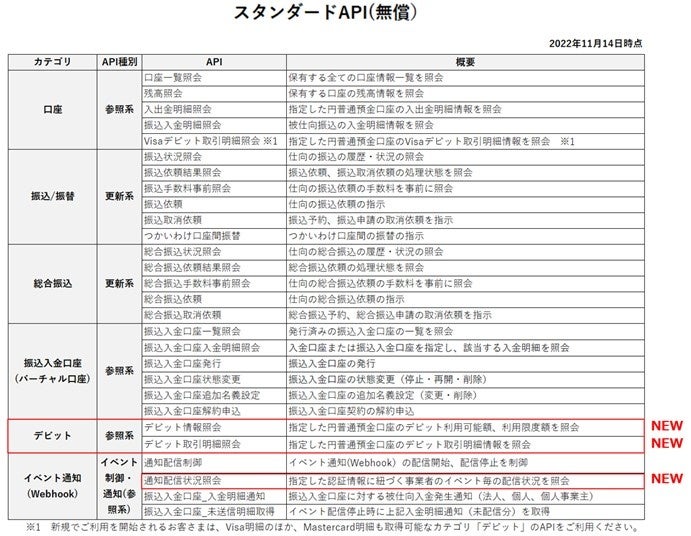 当社は、これまでのVisaデビットカードに加え、お客さまのライフスタイル、ビジネススタイルにマッチしたカードをお選びいただけるよう、本年10月17日より、Mastercard®デビット(*2)の提供を開始しております。APIにおいても、VisaとMastercard両方のデビットカード情報と取引明細の照会を行っていただける「デビット情報照会API」と「デビット取引明細照会API」の提供を開始いたします。