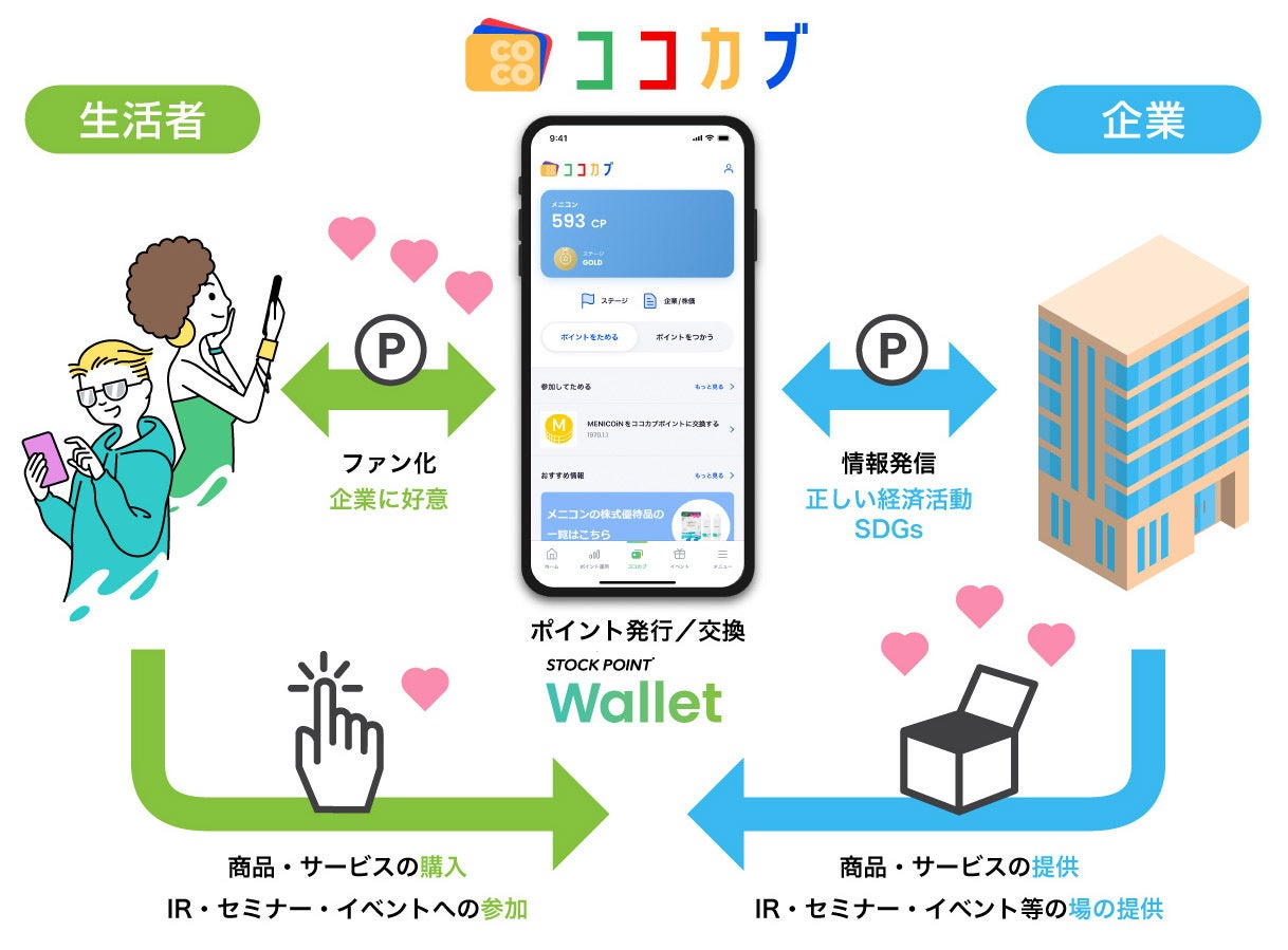 生活者は、いつも購入している製品や利用しているサービスで自然とポイントが貯まり、更にそのポイントが企業の株価に連動し日々増減することで、企業への興味関心が高まり、新製品への期待や企業の成長を応援したくなる。企業は『ココカブ』を通して、一生活者を製品のファン、ひいては企業の株主へとつないでいく究極のファンコミュニティを形成できる。