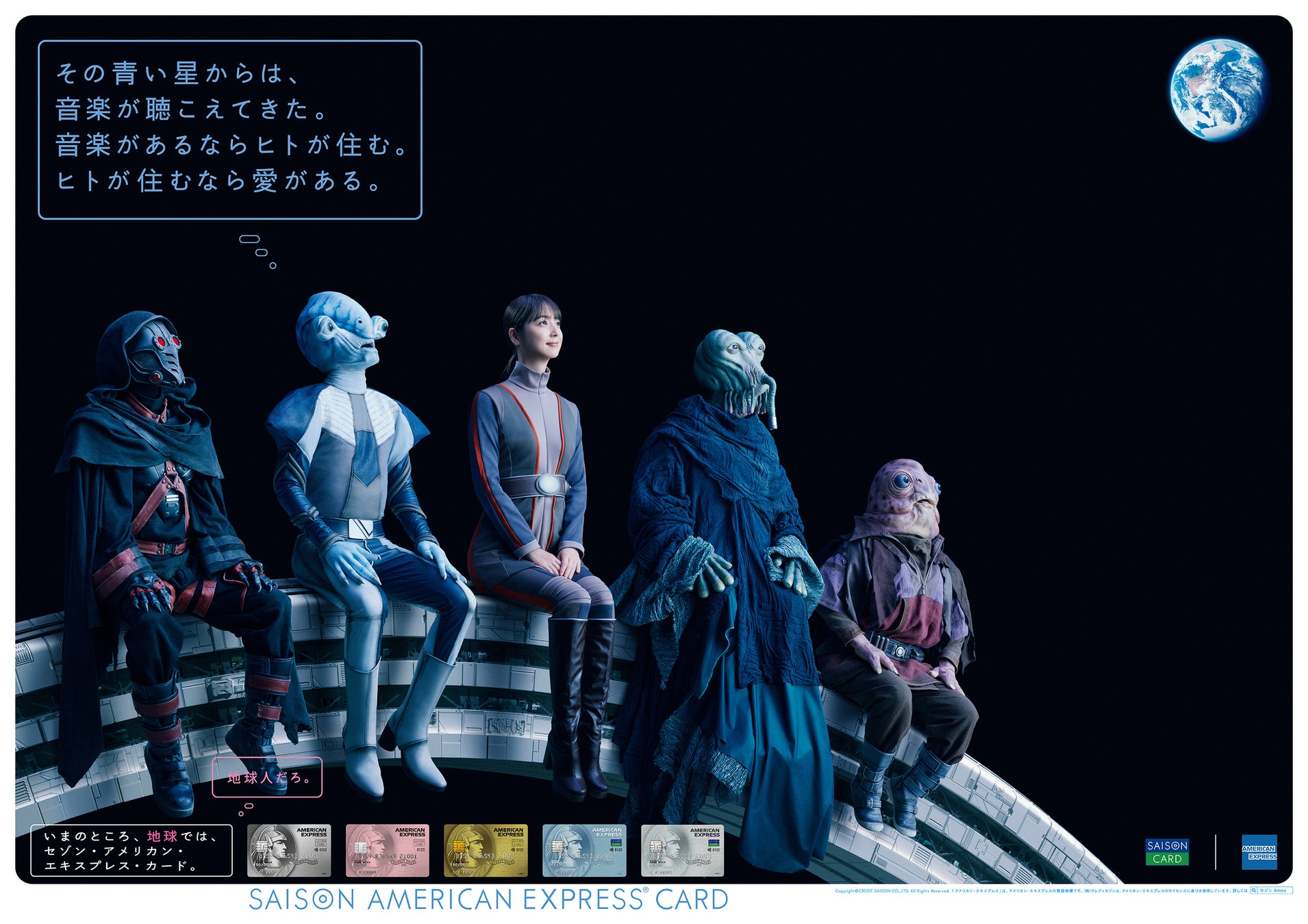 今回のCM では、宇宙を舞台に地球の未来を少し考えるシリーズとして、幅広いお客様のニーズに合わせてご利用いただける「セゾン・アメリカン・エキスプレス®・カード」の壮大さと、「地球人だろ」のコピーで、地球人ならこのカードを持つこと・利用することは特別ではないことを表現しています。