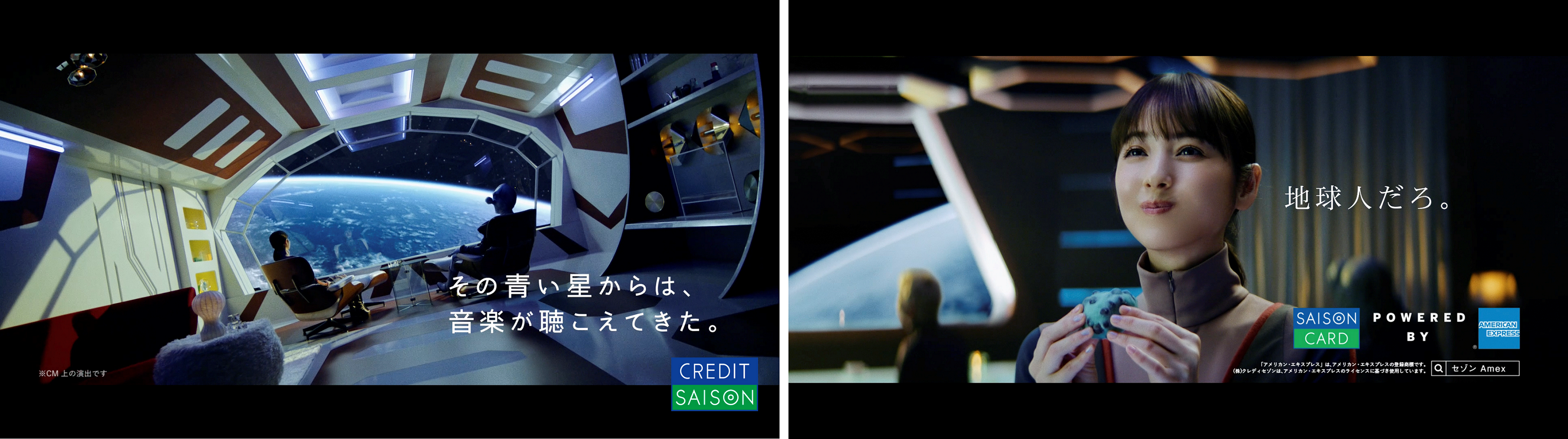 今回のCM では、宇宙を舞台に地球の未来を少し考えるシリーズとして、幅広いお客様のニーズに合わせてご利用いただける「セゾン・アメリカン・エキスプレス®・カード」の壮大さと、「地球人だろ」のコピーで、地球人ならこのカードを持つこと・利用することは特別ではないことを表現しています。