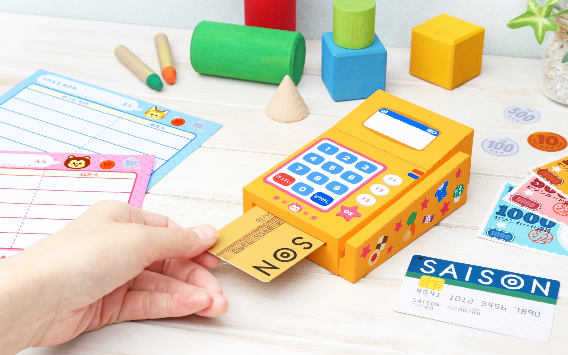 セゾンカードとカードリーダーのおもちゃを使いながら、親子でお金やキャッシュレス決済について楽しく学べるペーパークラフトを公開しました!どなたでも無料ダウンロードいただくことができます。