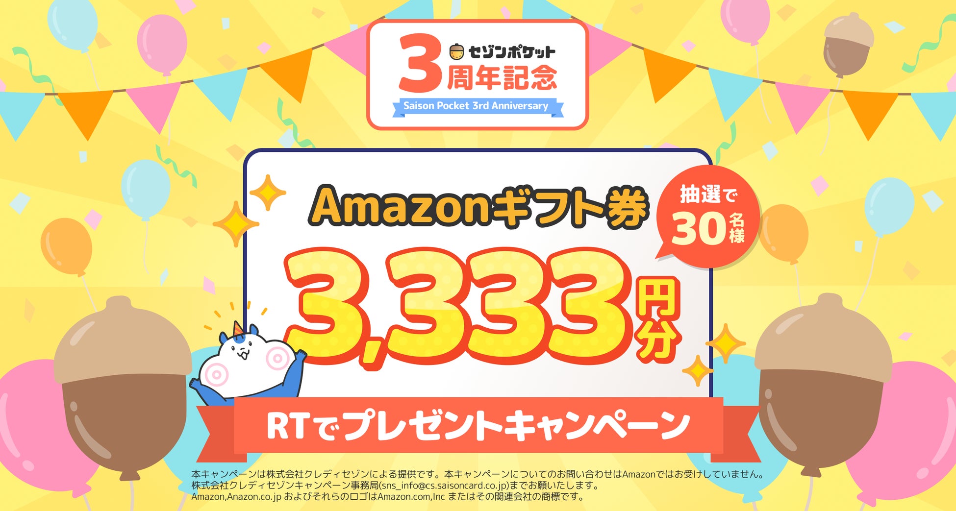 『セゾンポケット』が3周年を迎えたことを記念し、2022年11月21日(月)から抽選で30名様に3,333円分のAmazonギフト券が当たるリツイートキャンペーンを開催します。