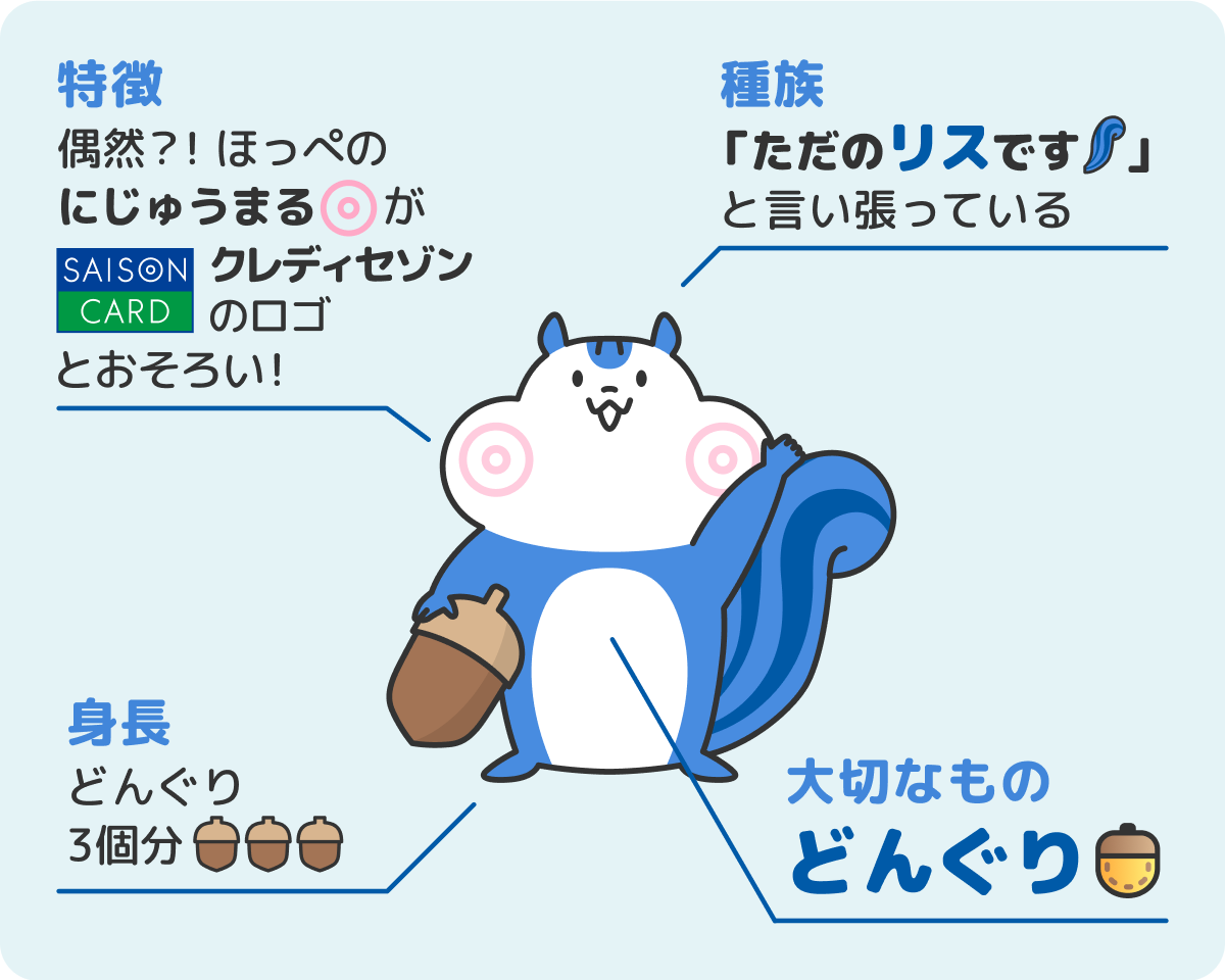 特徴:嬉しい時に輝く目と大きなしっぽがチャームポイント。ほっぺのにじゅうまるがクレディセゾンのロゴとおそろい!