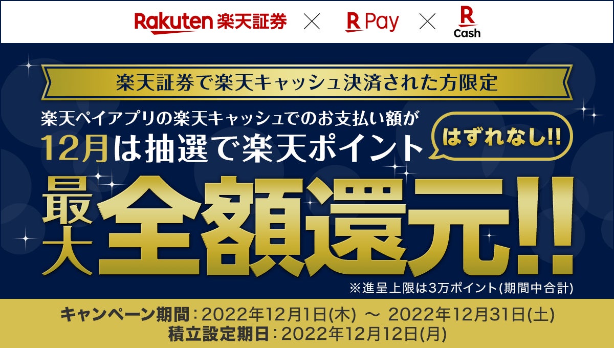 | キャンペーン期間 | ①「楽天キャッシュ」で投信積立 積立設定期日:2022年12月12日(月) 買付指定日:2023年1月1日(日)~2023年1月28日(土) ②「楽天ペイ」アプリで「楽天キャッシュ」のチャージ払いでの支払い 2022年12月1日(木) 0:00 ~ 2022年12月31日(土)23:59 |